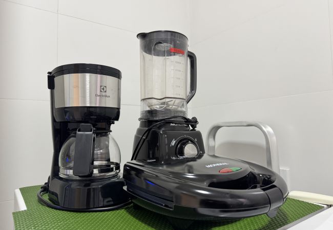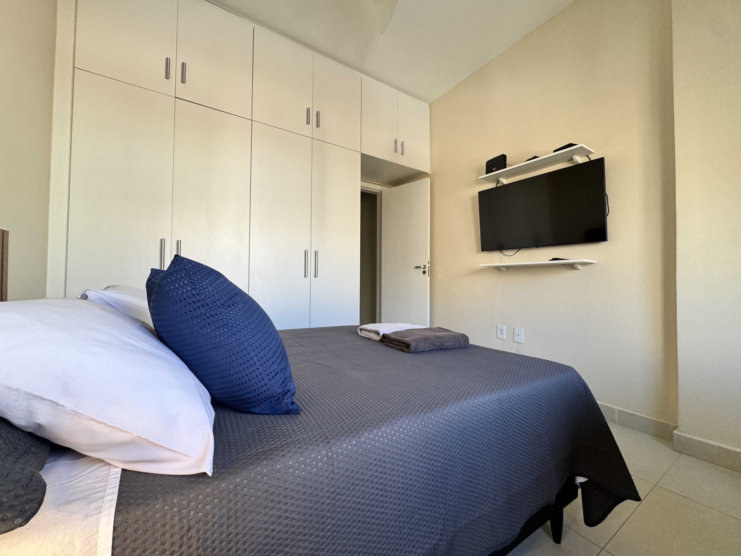 Apartamento de 40 m2, a una cuadra de la playa, con TV Smart en el dormitorio y la sala, WiFi de alta velocidad, aire acondicionado en el dormitorio, ventiladores de techo, dormitorio con cama, sala con sofá cama, cocina con microondas, cocina, refrigerador, cafetera, licuadora, tostadora.