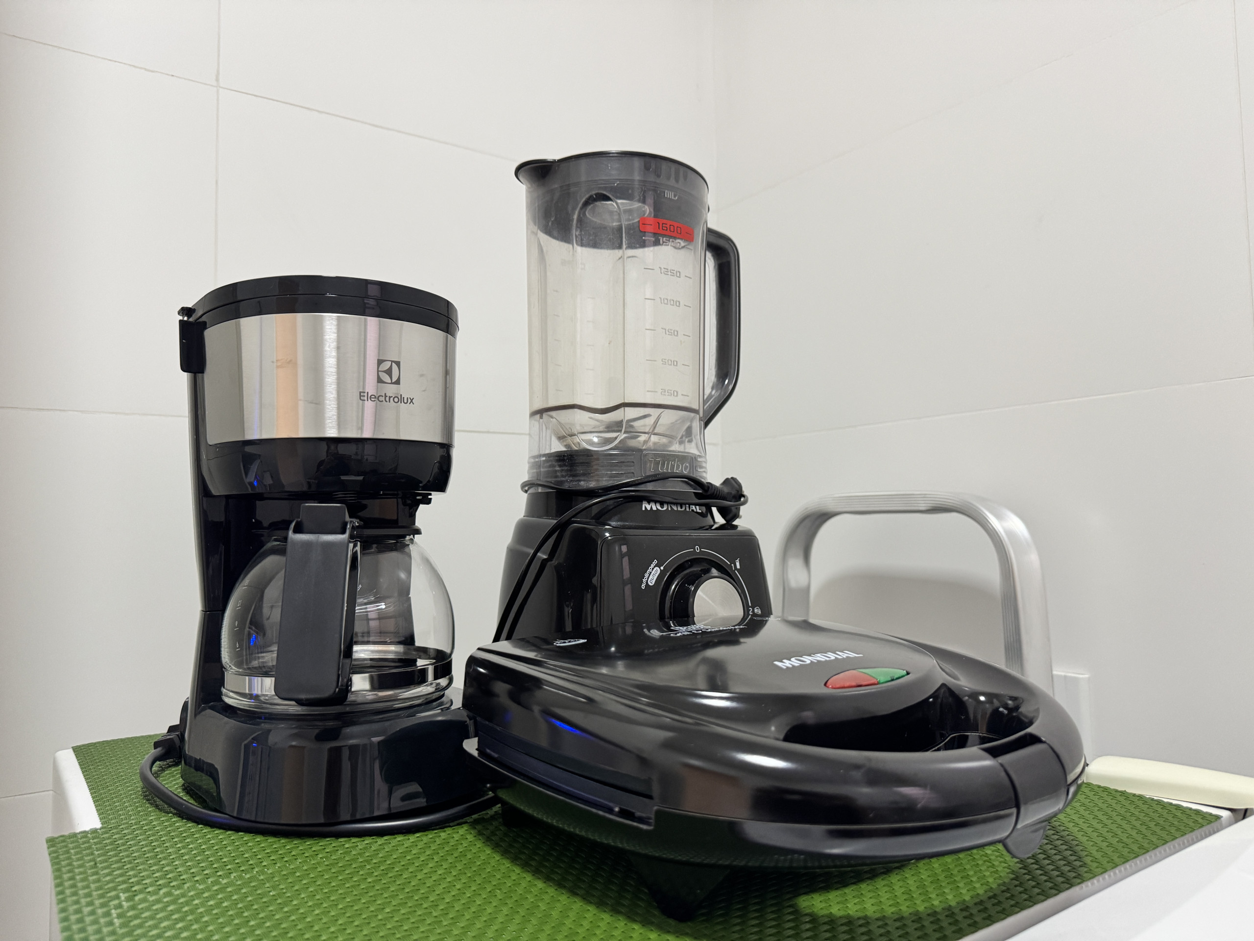 * Cocina con estufa, refrigerador, cafetera, licuadora, microondas, ollas y juego completo para 4 personas